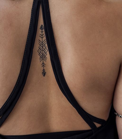 Spine tattoos are often large, but tiny tattoos look gorgeous when aligned with your spine. For example, this complex double-ended, black-ink arrow design is a very unique design. Also, it lines up perfectly with the spine to create a balanced finish.