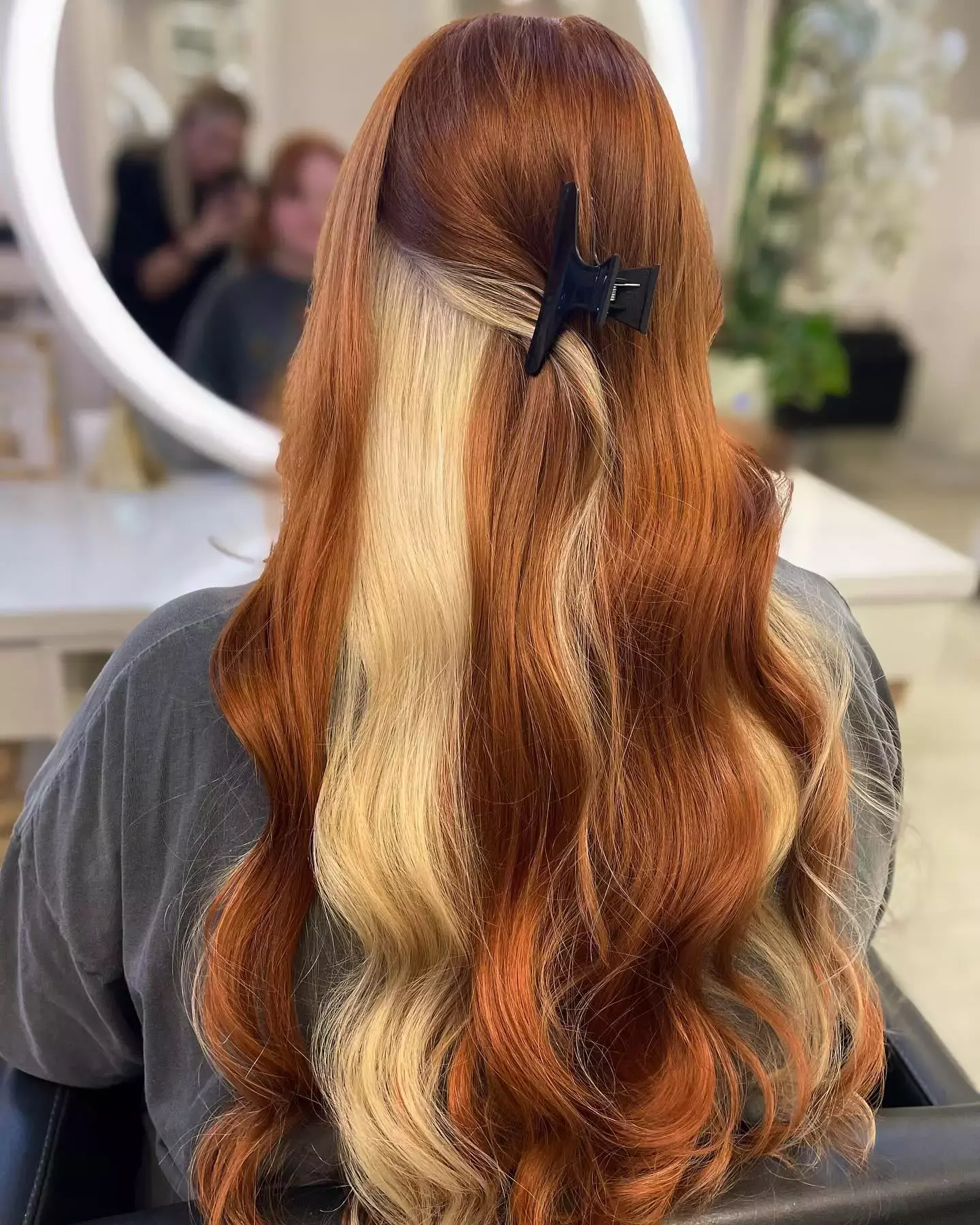 Bright copper paired with icy platinum creates a striking contrast that feels playful yet polished. The long, soft layers add a touch of sophistication to this bold color combination, making it perfect for trendsetters who love experimenting with color blocking.