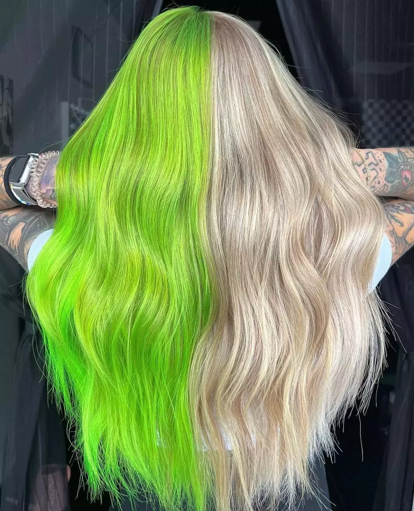 Vibrant neon green paired with sleek platinum blonde creates a daring, high-impact look. The soft waves add a touch of glam, balancing out the electrifying contrast. This bold color duo is perfect for trendsetters ready to embrace playful, head-turning vibes, whether for music festivals or just owning the streets.