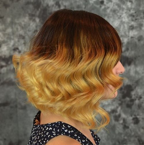 This amazing cropped bob is the perfect example to start our gallery of gorgeous short hair with an ombre style. This beautiful crop finishes above the jaw level, and works from a rich and dark brown at the root through to a lighter brown at the tip. This amazing style is finished with corkscrew curls from top to bottom to highlight the colour change.