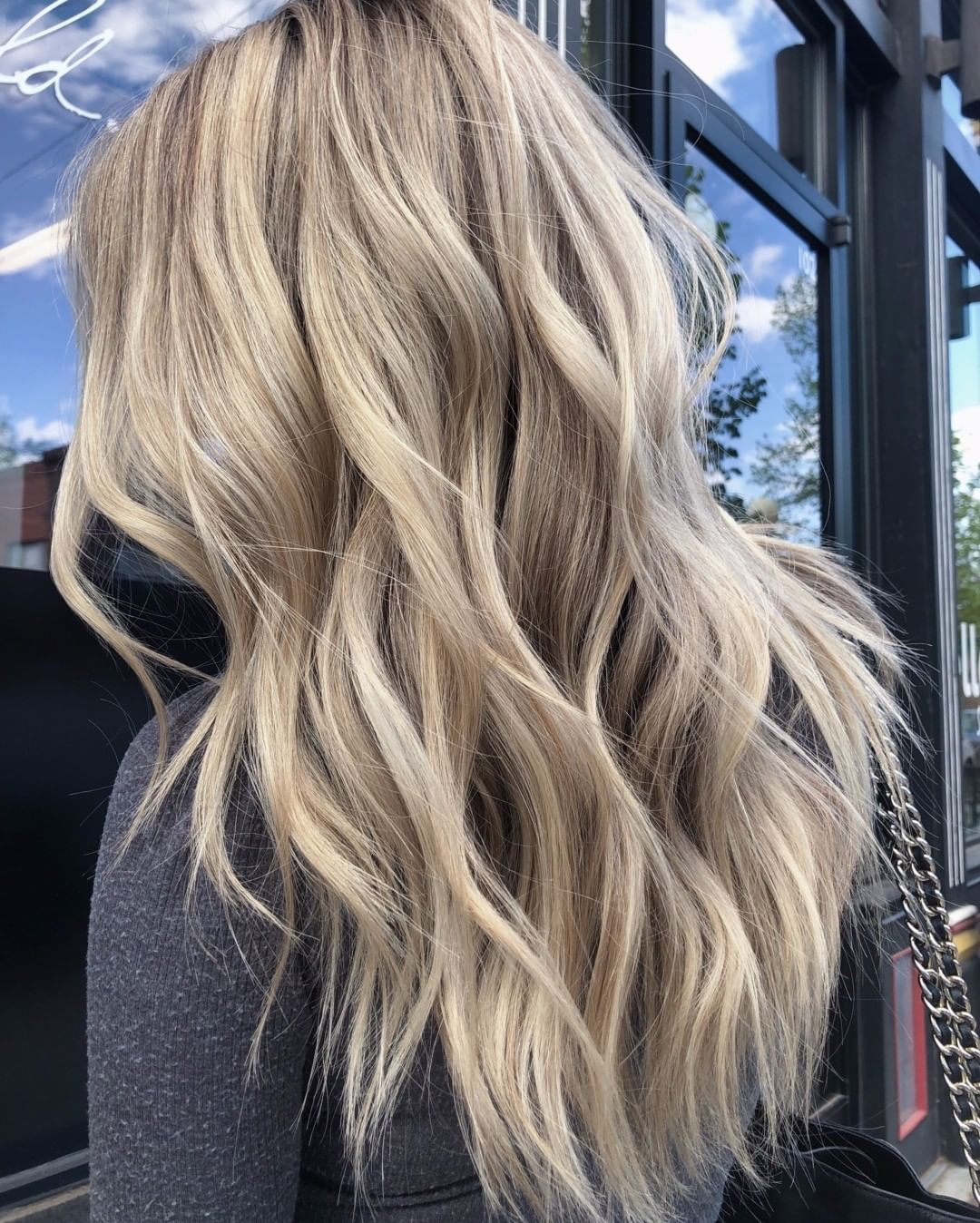 This dirty blonde look combine natural blonde roots with scattered lighter blonde highlights. It is perfect for naturally darker blondes who want to go lighter while maintaining a natural-looking, low-maintenance finish for their look.