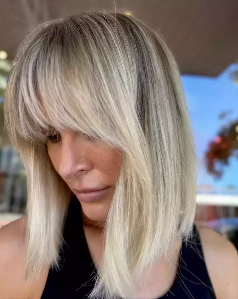 If you’re looking to make a bold statement, consider a sleek lob paired with a full fringe. This style is particularly flattering on those with fine hair, as the full fringe adds volume at the front while the sleek layers create a smooth, polished look. The combination of the straight cut and the thick bangs draws attention to your eyes and cheekbones, making this a very sophisticated and high-impact hairstyle. It’s perfect for those who want a look that’s both chic and modern.