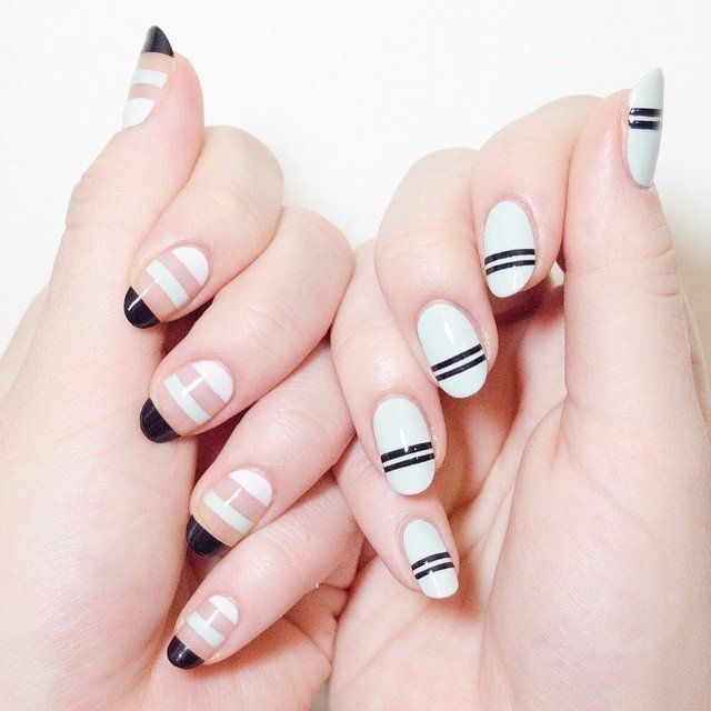These simple lines done across the natural nail give an instantly fabulous look. You can use a nail pen add some invisible tape to get your lines right, or use pre-made nail strips to achieve the design.