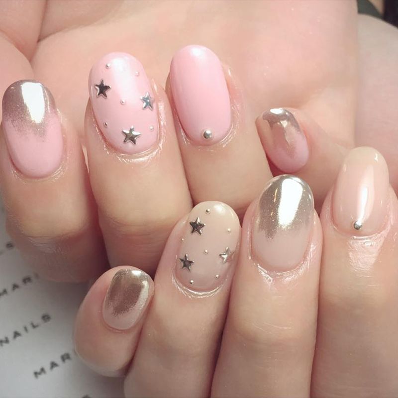 Using a base coat in a neutral color, adding just a few dots to the base of each nail turns boring nails into very pretty ones. Play with the size of your dots to find the minimalist look you love.